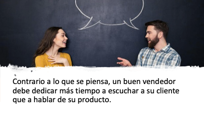 Contrario a lo que se piensa, un buen vendedor debe dedicar más tiempo a escuchar a su cliente que a hablar de su producto. En el mundo de las ventas existen dos clases de actividad: La venta Transaccional y la Venta Consultiva. El secreto de la venta consultiva consiste en escuchar y entender el cliente, para así entregar soluciones a la medida de sus necesidades. La venta transaccional debe ser simple y sencilla invitando a la acción con el uso de la tecnología.
