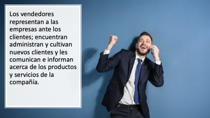 Los vendedores representan a las empresas ante los clientes; encuentran administran y cultivan nuevos clientes y les comunican e informan acerca de los productos y servicios de la compañía. Venden productos mediante el acercamiento a los clientes, la presentación de sus productos y servicios, la respuesta a las inquietudes y objeciones, la negociación de precios y condiciones de negociación y pago, y el cierre de ventas. Por otro lado, los vendedores prestan servicios a los clientes y efectúan labores de investigación e inteligencia estratégica de mercados para conocer mejor a sus clientes y las condiciones de la competencia.